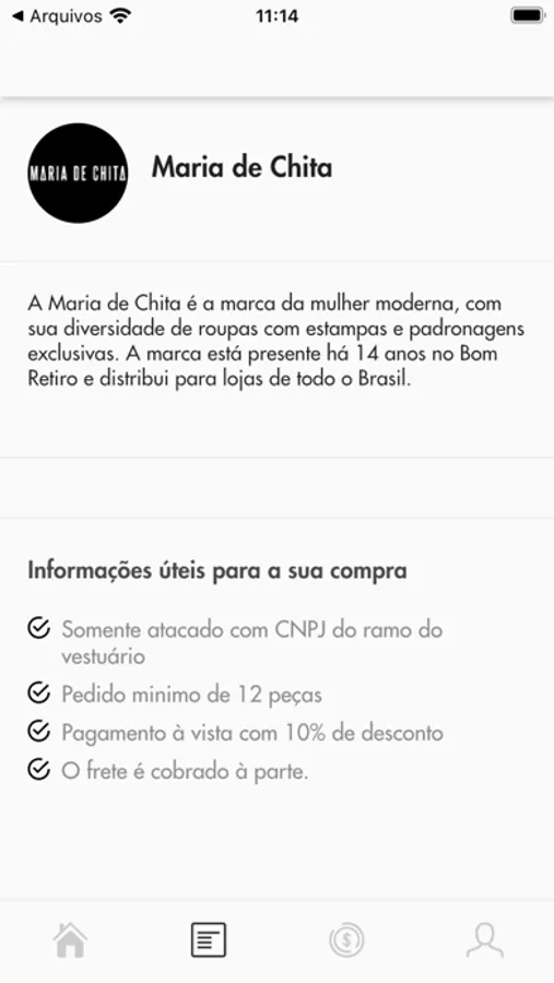 -Como funciona: se você for cliente da Maria de Chita, receberá um link de um vendedor de sua confiança por WhatsApp. Ao clicar no link você será direcionado ao App onde será exibido um catálogo com diversos produtos. Você poderá fechar orçamentos pelo App, além de ter acesso aos mais recentes lançamentos da Maria de Chita.