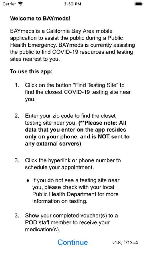 BAYmeds is a California Bay Area mobile application to assist the public during a Public Health Emergency. BAYmeds is currently assisting the public to find COVID-19 resources and testing sites nearest to you.