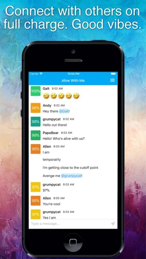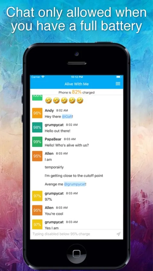 Join those who live life to the fullest by downloading Alive With Me. It's an anonymous group chat where sending messages is only allowed when your phone has over 95% charge. Instead of death and taxes, we cherish life and prosperity.