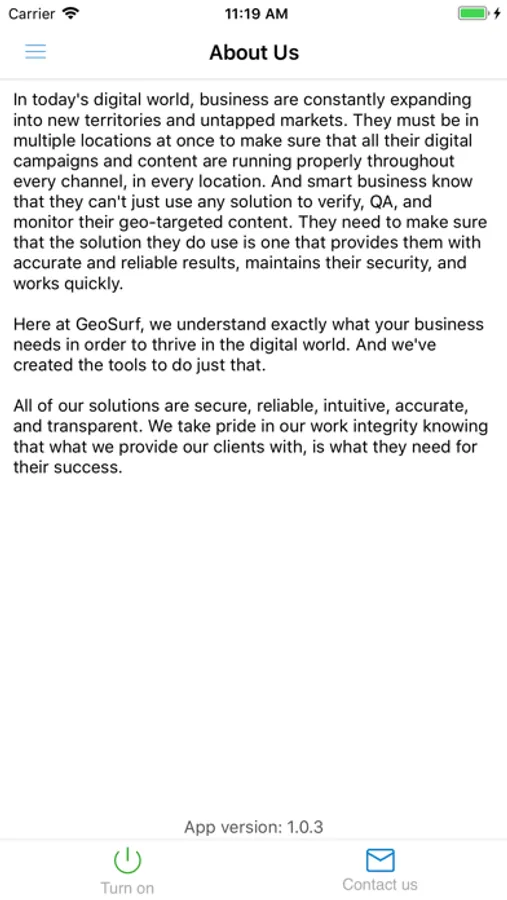 GeoSurf™ by BIScience is a VPN service that enables users to access premium VPN gateways in 130+ countries and cities around the world to access geo-targeted local content directly from your iPhone or iPad. With GeoSurf™ you can experience any web or app content as it resolves to a local user from each of our 130+ global locations.