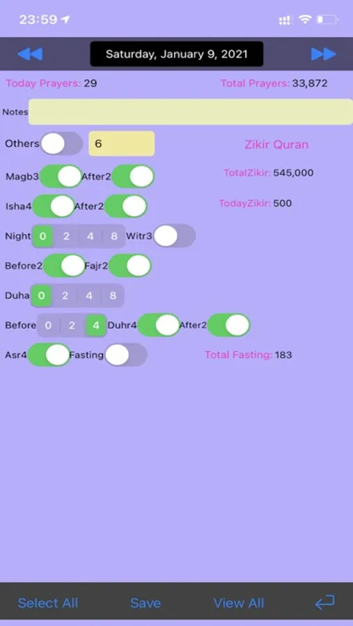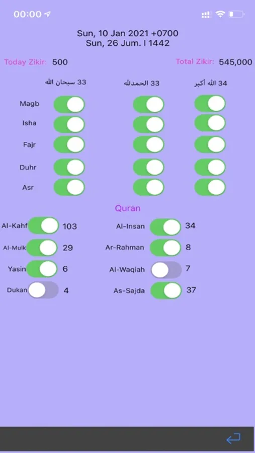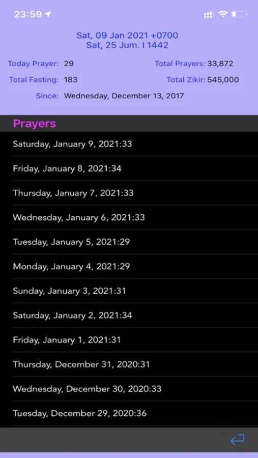 Logs total lifetime prayer, zikir, fasting, quran since the first day using app