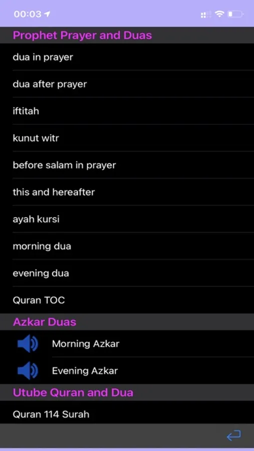 Tap Morning or Evening Azkar to listen to morning azkar and view the azkar text and its meaning