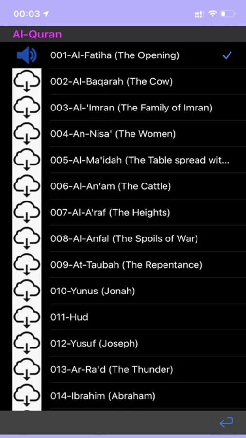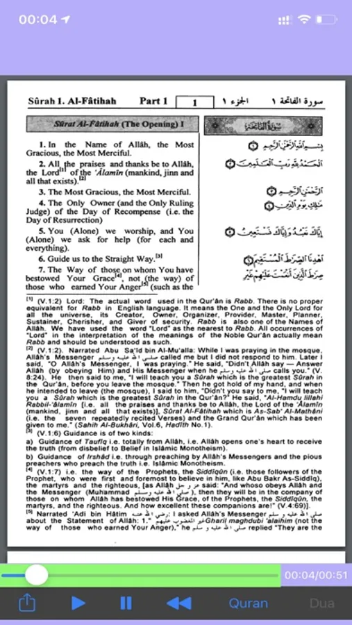 Tap Quran icon to display a table of Noble Quran from King Fahd Complex for the Printing of the Holy Qur'an with translation