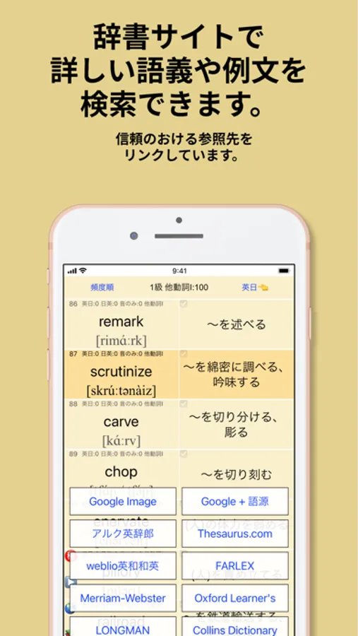 「日本語訳」のセル右上をタップするとチェックされ、チェックした単語を「単語帳」に登録できます。