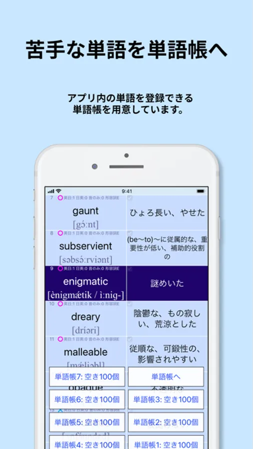 単語帳は7つ用意されています。苦手単語のオリジナル・単語帳を作ることができます。