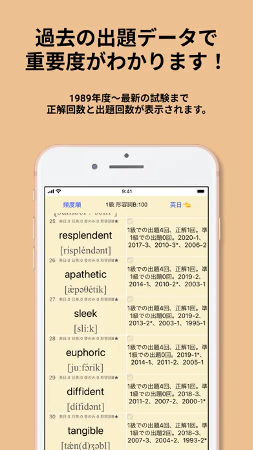 このアプリでは単語が品詞別にカテゴリー分けされており、過去の英検での正解になった回数、出題頻度の高い順にリストアップされています(正解数と頻度が同じ単語の順番はランダムです)。
