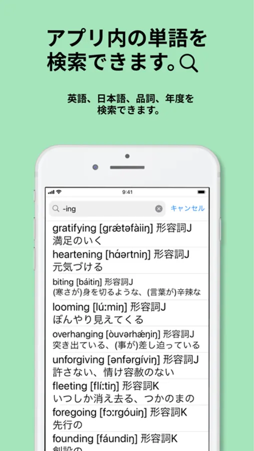 検索ページでは単語や意味、発音記号から検索することができます。検索した単語から品詞別リストへ移動できます。