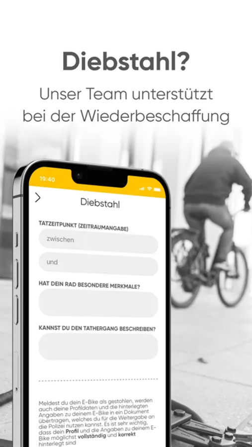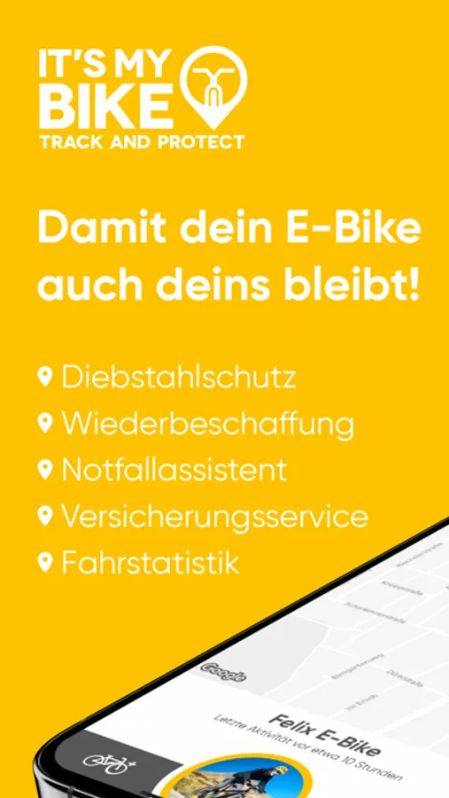 IT'S MY BIKE liefert die Basis für das vernetzte E-Bike. Mithilfe unseres an die App gekoppelten GPS-Trackers kannst du dein E-Bike schnell und einfach wieder finden. Hinterlege wichtige Informationen zu deinem E-Bike, die im Diebstahlfall schnell an die Polizei weitergereicht werden können. Wir unterstützen dich dann in enger Abstimmung mit den örtlichen Beamten bei der Wiederbeschaffung deines E-Bikes. Zusätzlich bietet dir IT'S MY BIKE eine ganze Servicewelt wie z.B. Fahrstatistiken und einen digitalen Notfallassistenten, der im Falle eines Sturzes Hilfe zur Unfallstelle sendet.