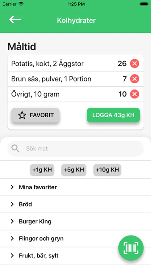 • Söka fram kolhydrater med hjälp av att scanna streckkoder på mat