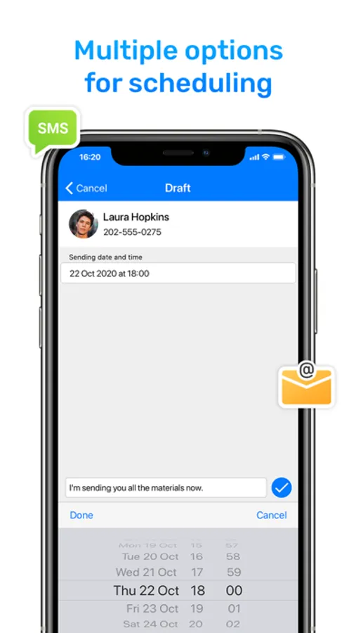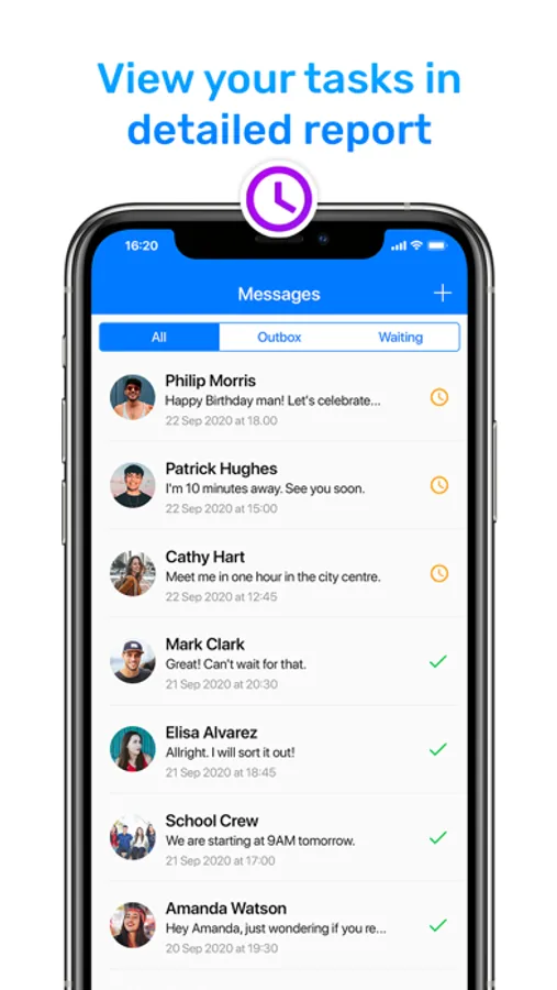 With Messages Scheduler for iOS will never forget to send an important text messages or emails. Create Message with reminder on selected time and date. You can send SMS, MMS or emails with text, pictures, video or Gif. Intuitive and fast Reminder with Scheduled messages.