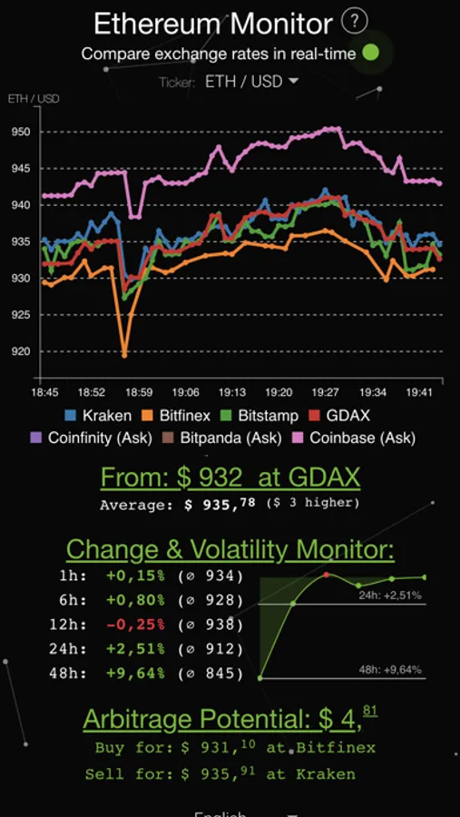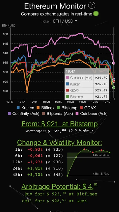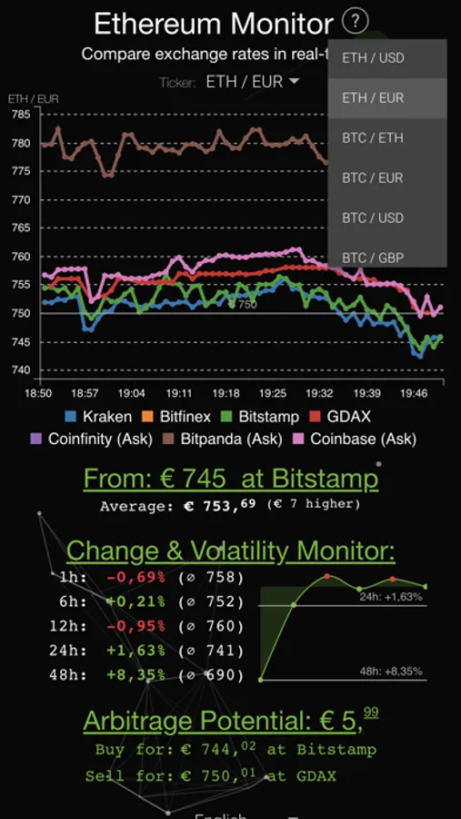 Compare cryptocurrency prices from Kraken, Coinbase, GDAX, Bitfinex, Bitstamp, Bitpanda & Coinfinity with arbitrage calculation! Support for Ethereum, Bitcoin, Bitcoin Cash & Litecoin with real-time exchange rates in Euro, Dollar & GBP. Make the best buy decision with our visualization with price comparison across exchanges, lowest price detection, arbitrage potential calculation, change & volatility monitor and performance check between cryptocurrencies (BTC, ETH, BCH, LTC) with prices for €, $ and £.