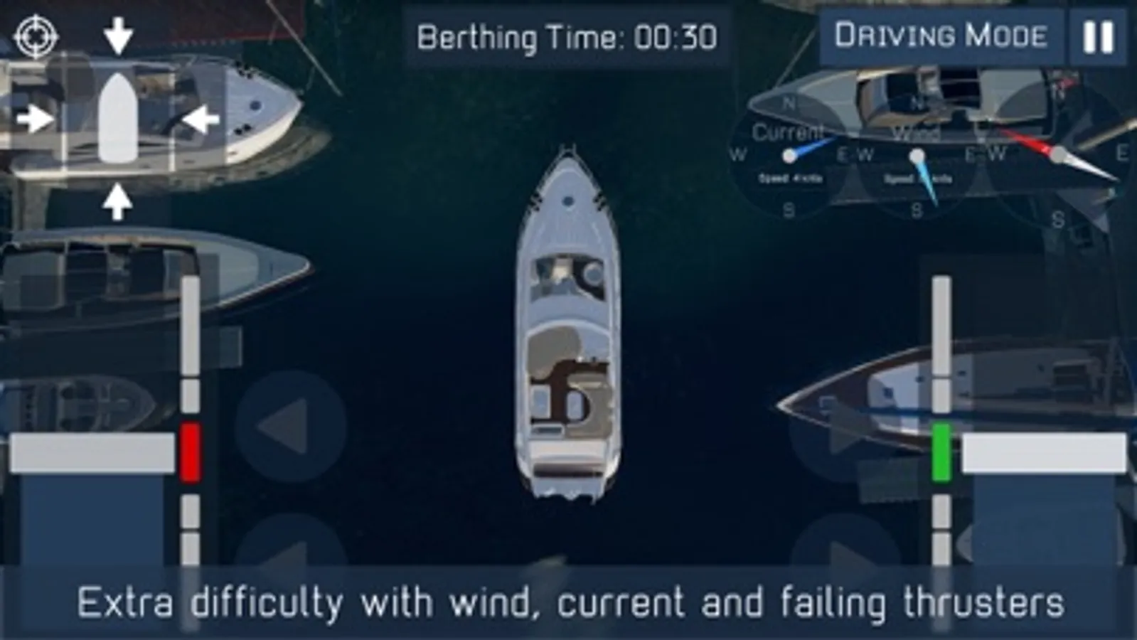- Drive and berth a motorboat or superyacht (see screenshots) with 2 engines and bow and stern thrusters, using either berthing controls which allow access to all thrusters and easy individual engine control or driving mode which provides a steering wheel and individual or simultaneous control of both engines.