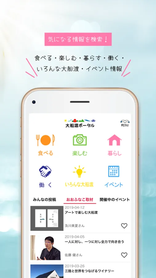 1.食べる/楽しむ/暮らす/働く/いろんな大船渡/イベント情報 から、検索することができます。オオフナコが取材した基本情報には取材済スタンプが!すべて無料で見放題!