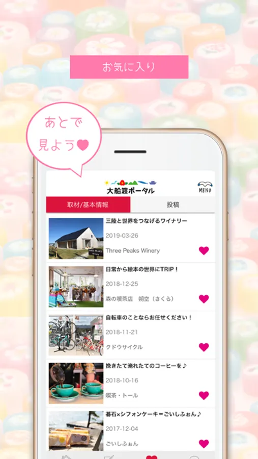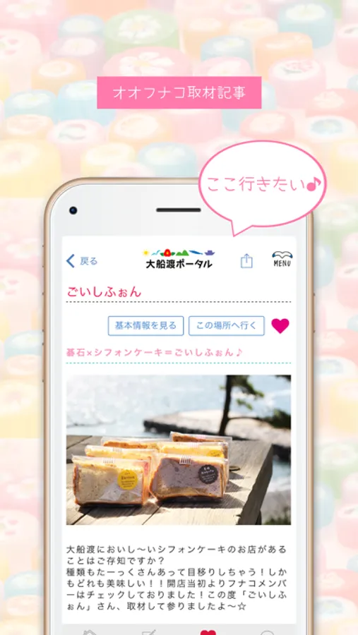 3.オオフナコの取材記事・気になるスポットやお店の基本情報・みんなの投稿をお気に入りすることで「あとで見たいリスト」をつくれます!