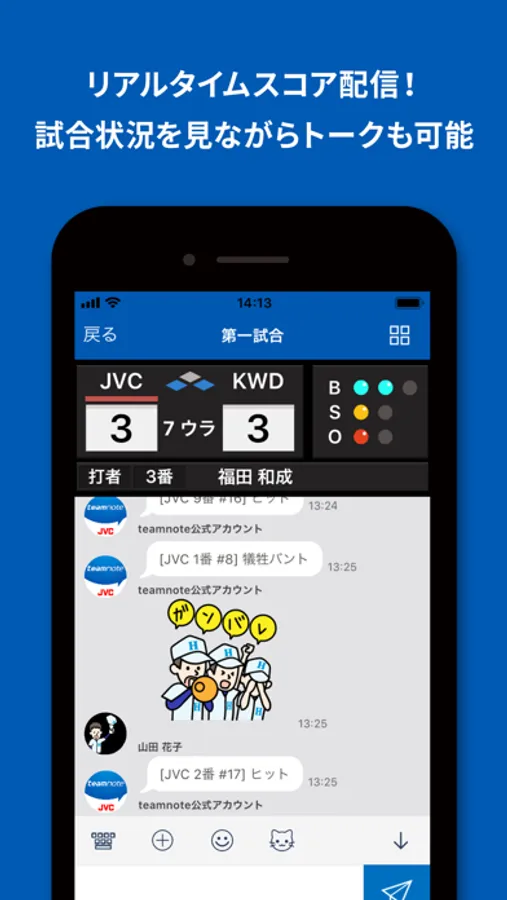 会場に行けなくても、リアルタイムに更新されるスコアやスタッツ、ランニングスコアを見ながら、チャットやスタンプを送って、メンバー全員でチームを応援できます。