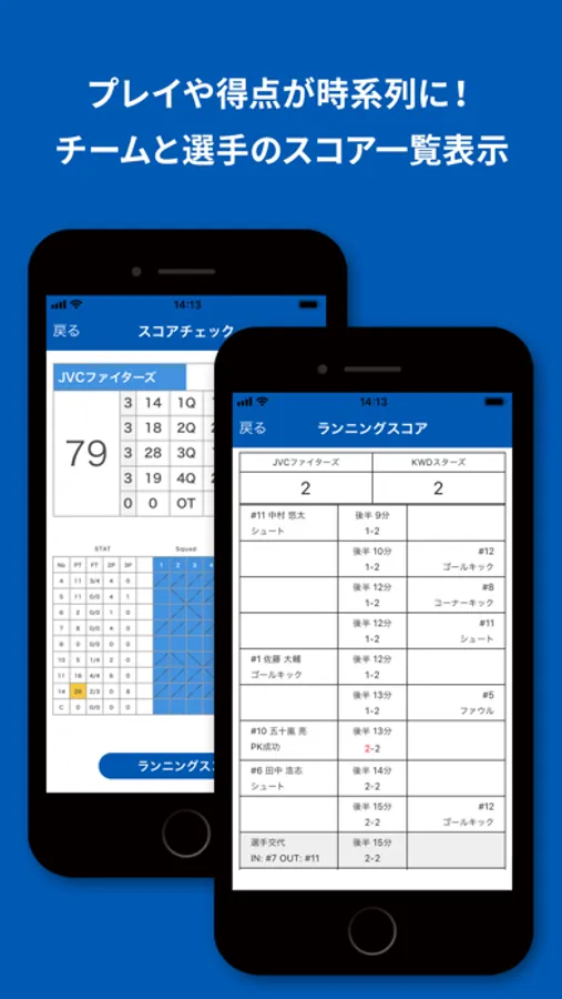 選手ごとの成績(バスケの場合は、シュート、フリースロー、ファウルなど)や出場状況を一覧表示します。試合全体の状況が把握でき、チーム分析にも役立ちます。