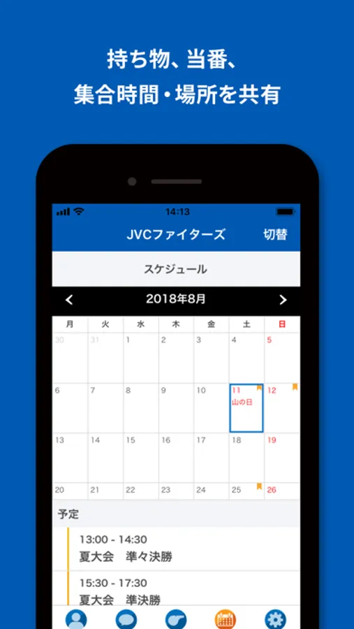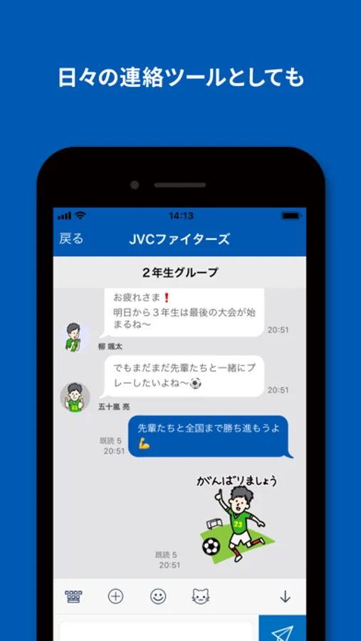 チーム内で個人トーク、グループトークが楽しめます。日常のトークはもちろん、練習や試合のトークでも使える楽しいスタンプを多数用意しています。スタンプも今後継続して追加していきます。