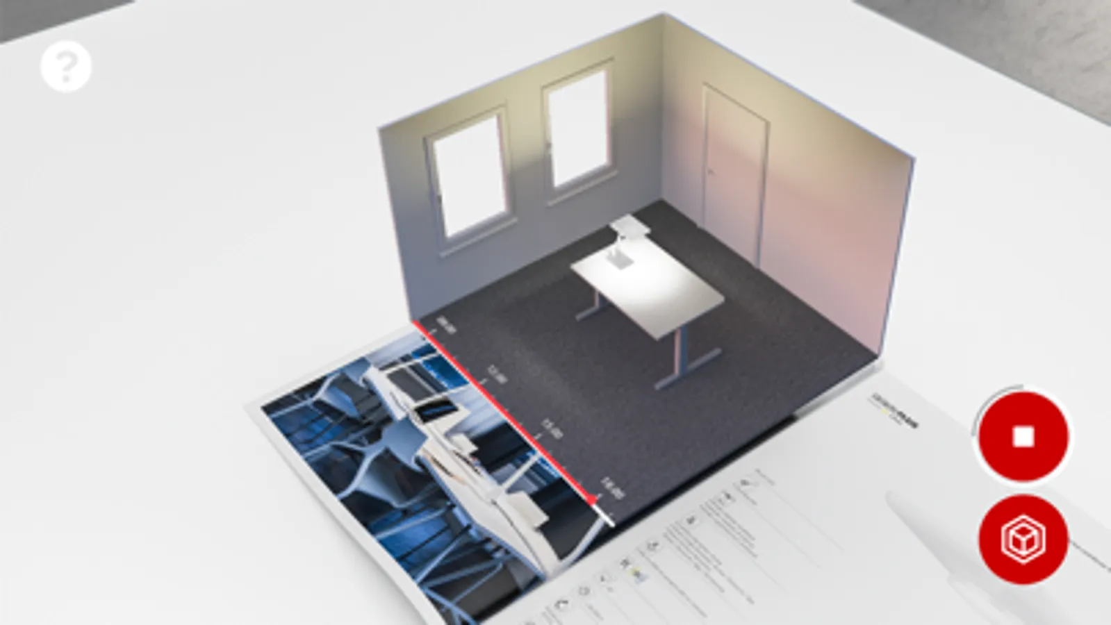 If you are interested in experiencing the augmented reality function please visit our website and order or download and print our AR-capable brochures and catalogues at www.trilux.com/catalogues. Start the AR app, and scan the application and/or product pages of the products marked with the AR symbol in the brochure/catalogue with the camera. The 3D model is displayed as soon as both angle and distance are correct. Click on the symbols and let the TRILUX world surprise you!