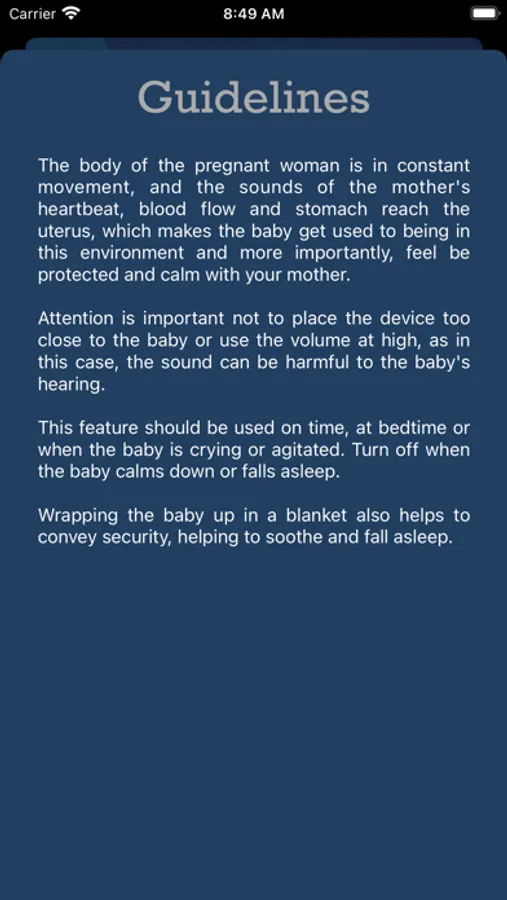 Application capable of calming your baby emitting the sounds of the uterus, does not need internet to work, simple and easy to use.