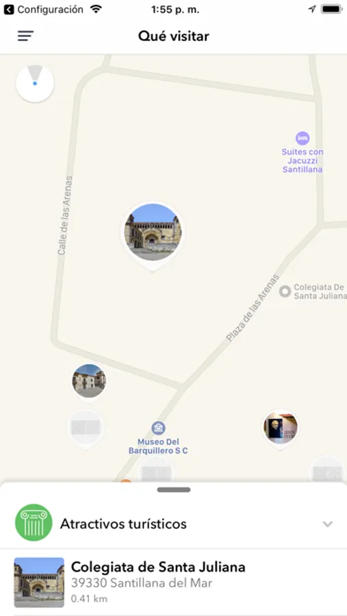La aplicación GUÍA SANTILLANA te guiará por el municipio, ubicando los recursos turísticos, referentes gastronómicos y los principales establecimientos comerciales. En la sección "Qué visitar" encontrarás, geolocalizados en un mapa, los restaurantes, bares y cafeterías, albergues y alojamientos rurales, apartamentos, comercios, atractivos turísticos, camping y hoteles, divididos por categorías. Gracias al geoposicionamiento podrás saber qué puntos y servicios de interés están más cerca de tu ubicación. También dispone de un visor de realidad aumentada para ubicar los diferentes puntos. Se podrá acceder a este visor pulsando sobre el botón de “Realidad aumentada” ubicado sobre el mapa.