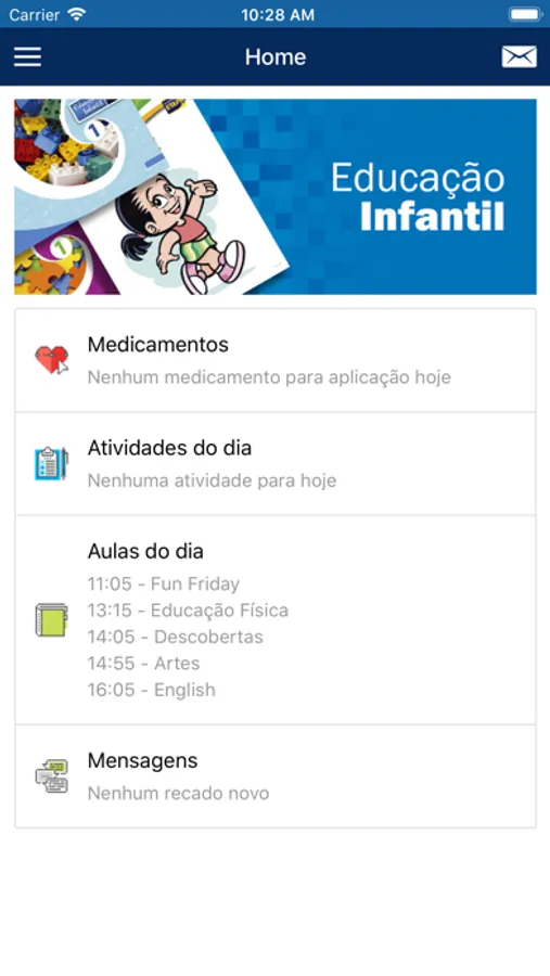 A opção Home mostra as principais informações do aluno e suas atividades no dia a dia.