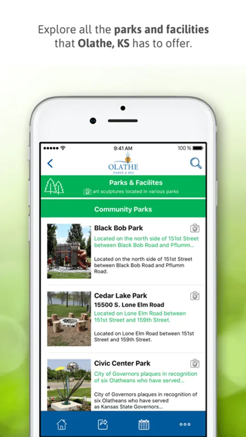 The Olathe Active App is the one-stop shop for all things Olathe Parks & Rec. In one place you can search for local events, sign up for recreational programs, find local parks, facilities and trails in the City of Olathe Kansas. Each park and facility is listed with its amenities, hours, events, programs and a Google map to provide directions. You can also search for events and recreation programs within your desired park or facility and add to your calendar or share with friends and family.