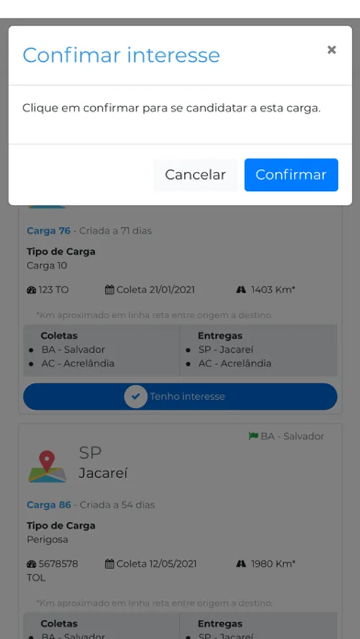 · Segurança na transação de aceite da carga