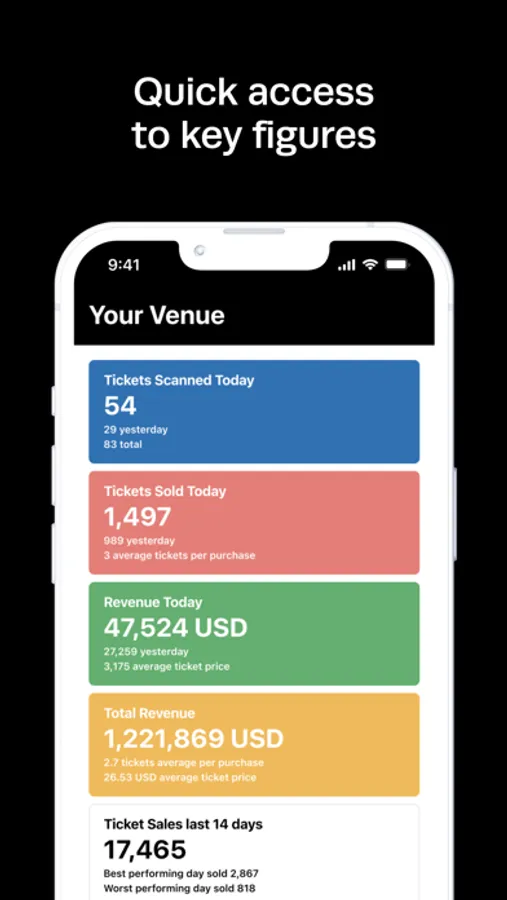 The app gives users a quick view of the most important figures such as tickets sold today and yesterday, total revenue of upcoming events and sold amount of tickets per day the last 14 days. Then start exploring how many tickets are sold and how much revenue is generated by different ticket types.