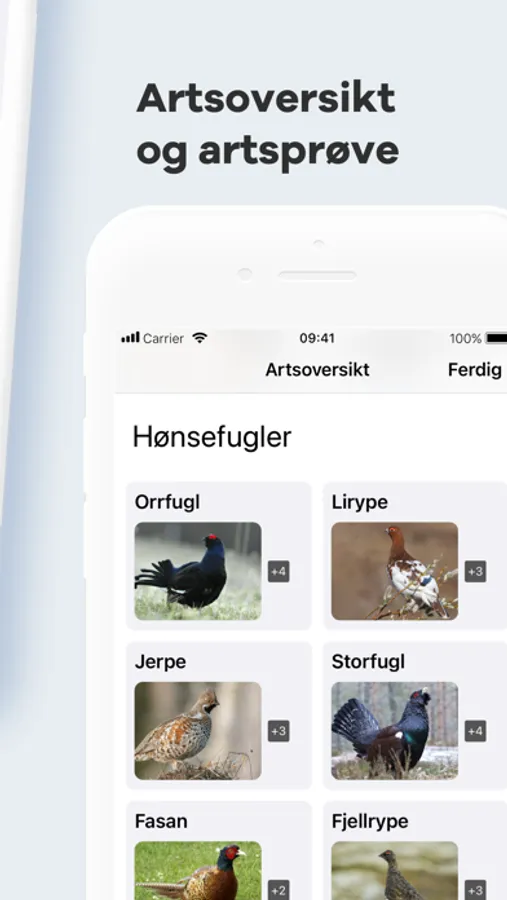 Appen lærer deg å kjenne igjen de jaktbare artene fra forskjellige vinkler, av forskjellige kjønn, og i både sommer- og vinterdrakt.