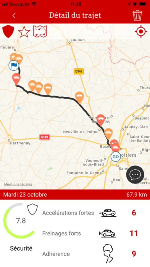 - un score de sécurité qui prend en compte vos accélérations, freinages et limites d’adhérences