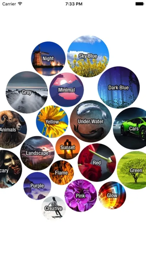 Get different category wallpapers in one App. Our wallpaper categories are Black,Sky Blue,Orange,Pink,Green,Gray,Purple,Dark Blue,Red,Yellow,Nature,Glow,Under Water,Funny,Minimal,Scary,Flame,Car,Animal.