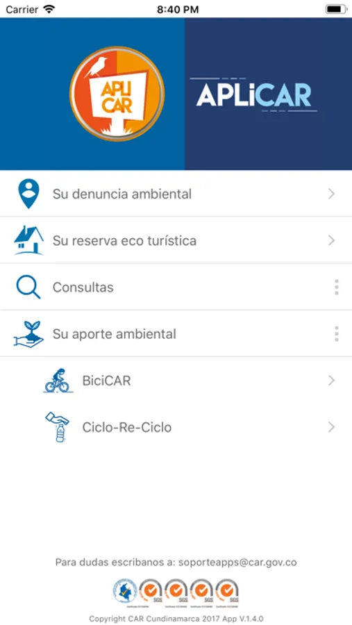 APLICAR es la app oficial de la Corporación Autónoma Regional de Cundinamarca - CAR. Con APLICAR puede reportar o denunciar afectaciones en nuestros recursos naturales: agua, suelo, aire, fauna y flora dentro de la jurisdicción CAR. Adicional, puede realizar seguimiento a trámites y expedientes. Las reservas en los parques por ahora no están disponibles debido a la emergencia de COVID-19. Otras herramientas disponibles son BiciCAR y Ciclo-Re-Ciclo. Ingrese a ciclo-re-ciclo y encuentre los contenedores más cercanos para reciclar: pilas, botellas y tapas.
