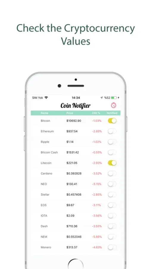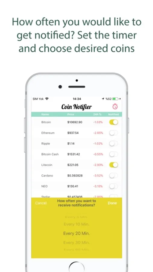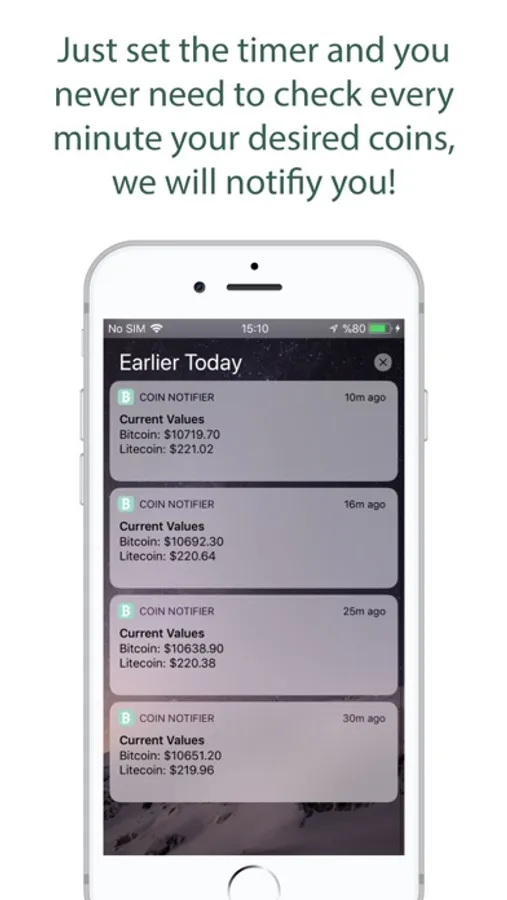 We know your curiosity about your coins, haven't you get tired checking coin prices every 5 min ? With Coin Notifier you will be able to check your coin values from your lock screen. You just set time interval as 5, 20, 60 ... minutes and you choose the coins that you want to get notified and we handle the rest. You will get notifications according to your desired time interval and coins!