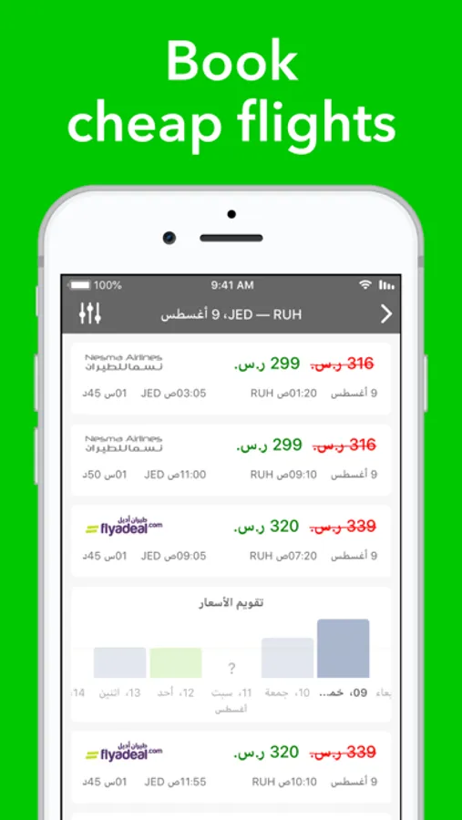 حجز أرخص رحلات الطيران لم يكن بهذة السهولة من قبل! سيقوم تطبيق رحلات الخصم بالمقارنة بين أسعار تذاكر الطيران من مئات شركات الطيران ووكالات السفر، وسيقوم بتوصيل عروض مثالية إلى جهازك مباشرةً.