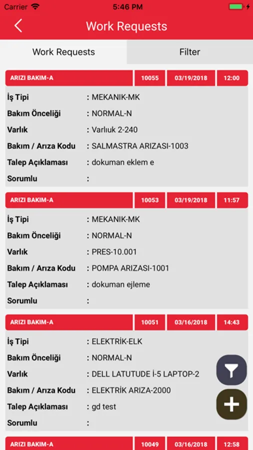 İş talebi ve İş emri sayfalarında bulunan hazır filtreleme seçenekleri ile veriye hızlıca ulaşıp zaman kazanacak, onay bekleyen taleplere onay verip yeni iş talepleri oluşturabileceksiniz ayrıca tamamladığınız bakımlar ile ilgili bilgileri de iş emri üzerinde rahatlıkla kayıt altına alabileceksiniz.