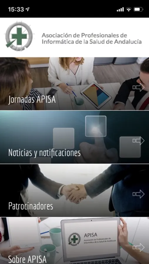 En nuestra app de APISA, Asociación de Profesionales de Informática Sanitaria de Andalucía, podrás encontar las siguientes secciones: