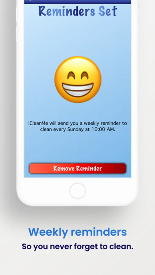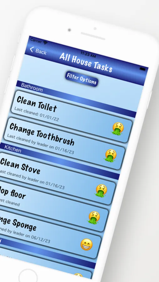 Each task you add will ask you how often you'd like it cleaned. From there, an emoji will be displayed indicating the state of that task. A happy emoji means a happy task. You'll know when something needs to be cleaned when the emoji isn't looking so good.