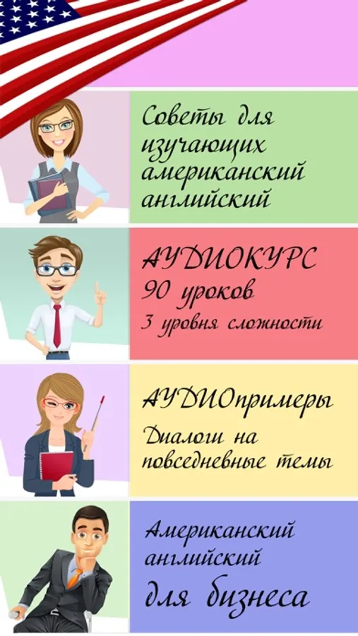 Помимо базовых аудиоуроков здесь вы найдете аудиолекции по тонкостям американского произношения, главным идиомам и фразовым глаголам, разнообразным слэнговым особенностям.