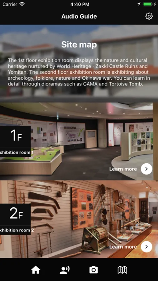 As you approach the number marker of each exhibit, photos and text commentary appear automatically. Voice guidance is also available.