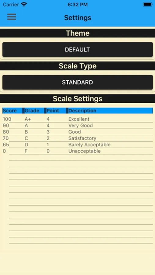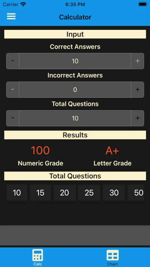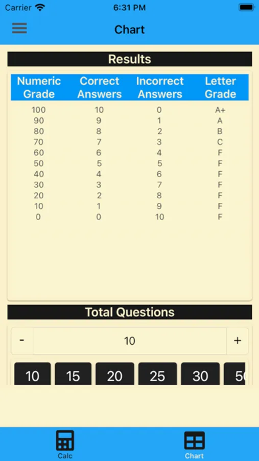 Easy Grader helps you to find assignment grades by either calculating results or scanning a table of all possible results. The calculator mode allows you to quickly find a numeric and letter grade based on the total number of questions and the number of correct or incorrect answers. The chart mode displays a simple table of grades based on a variable number of total questions which you can define. Use the calculator when you need one quick grade at a time. Use the chart when you are grading multiple papers and simply need a quick reference. You can also choose between multiple grading scales for proper calculation of letter grades.