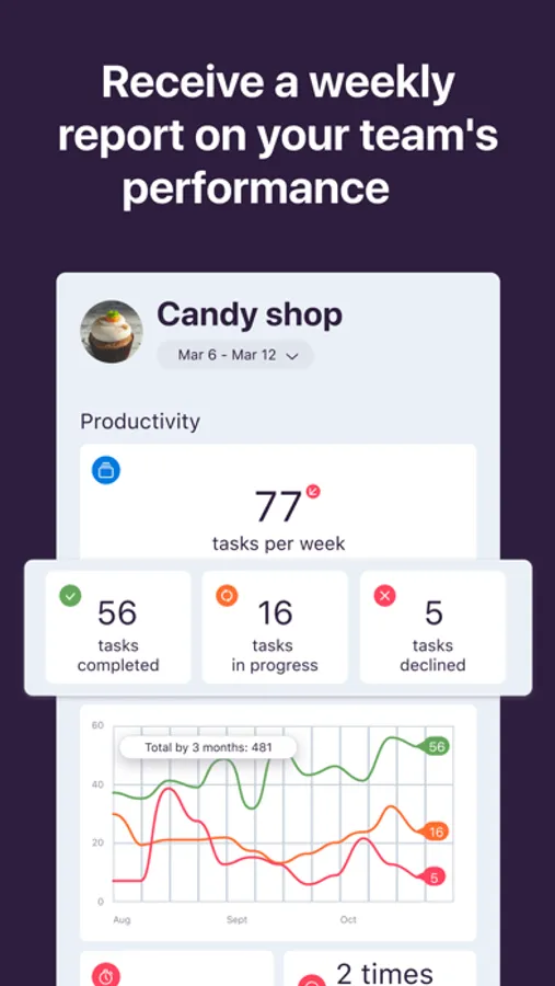 You will receive a weekly report with statistics of completed and failed tasks for groups, projects, processes, as well as for specific people.