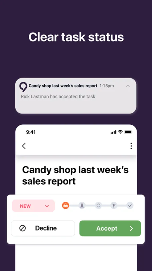 The assignee confirms they have received the task, and you see a notification that the task has been accepted. Clear and comprehensible statuses let you track what is going on.