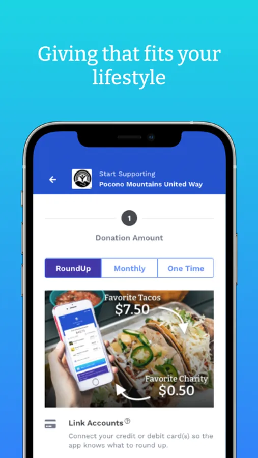 - RoundUp your purchases, give monthly, or make one-time donations to multiple organizations.