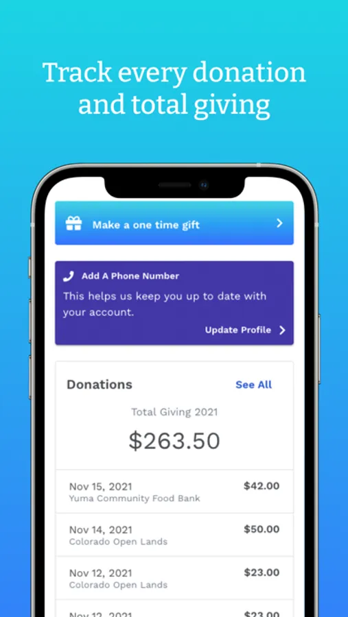 - Track pending donations, RoundUp donations, and monthly gifts.