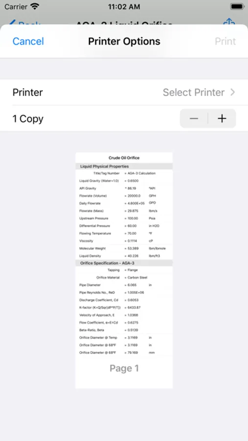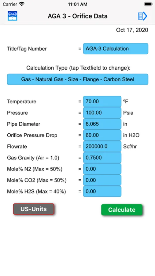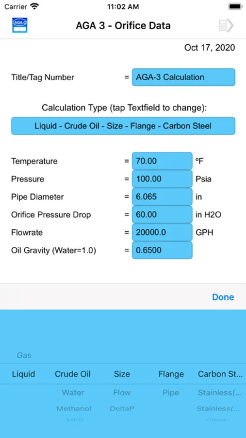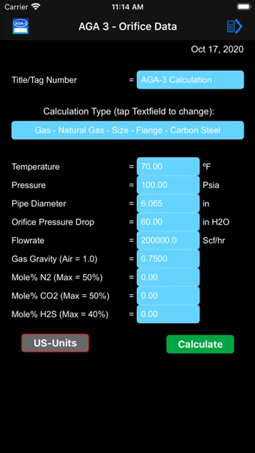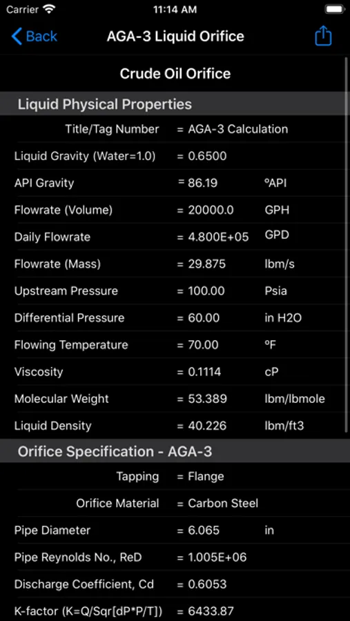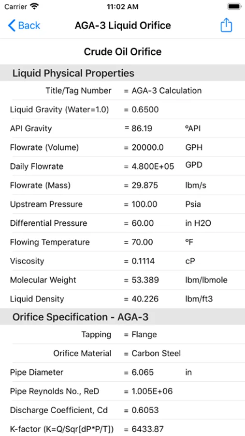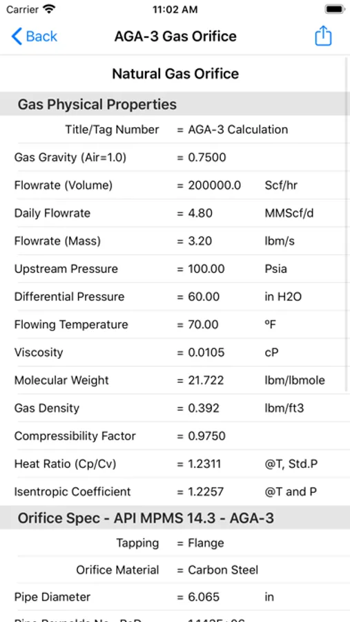 AGA-3 Orifice calculates size, flow-rate or pressure drop for gas and liquid flow orifice meters based on the American Gas Association AGA Report No. 3 (AGA-3) (also API Manual of Petroleum Measurement Standards, Chapter 14.3). Orifice Size is calculated from given flowrate and pressure drop, Flowrate is calculated from given size and pressure drop and Pressure Drop requires orifice size and flowrate.