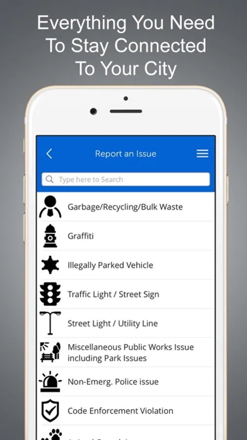 Use the Report an Issue section to report graffiti, potholes and other issues directly to the correct city department right from your phone. The issues are tracked from the initial report to resolution in the "My Reports" section and you will receive push notifications as your report progresses.