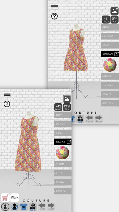 服のパーツごとに柄を変えられて、さらにその位置や向き、サイズも調節できちゃうから、組合せは無限大!