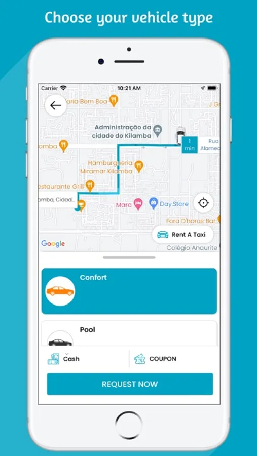 1. Faça o Download e registe-se na app; 2. Coloque o seu destino e selecione o tipo de serviço;