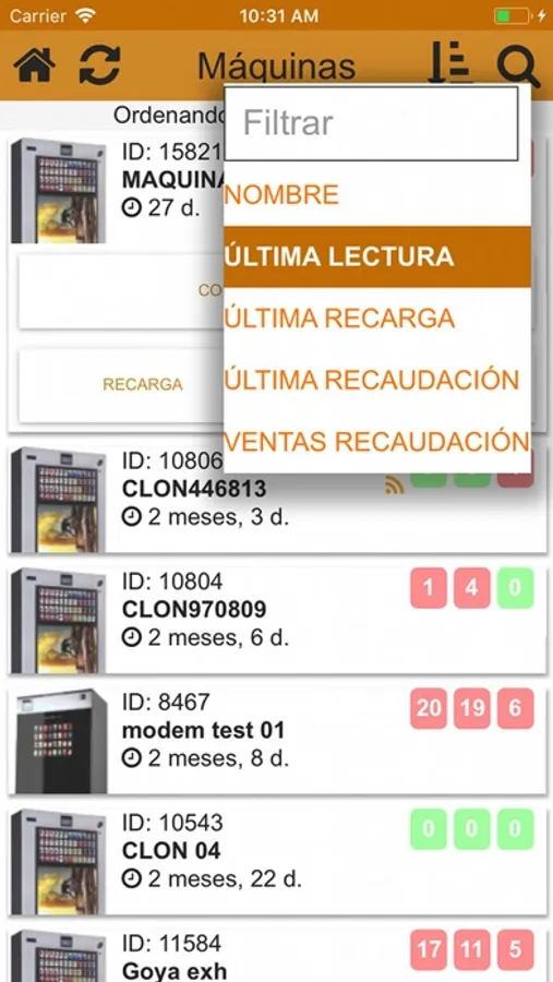 Listado de Máquinas : En este módulo el usuario puede tener un control total del inmovilizado de la máquinas mediante las herramientas de inventario, recarga o visualización.