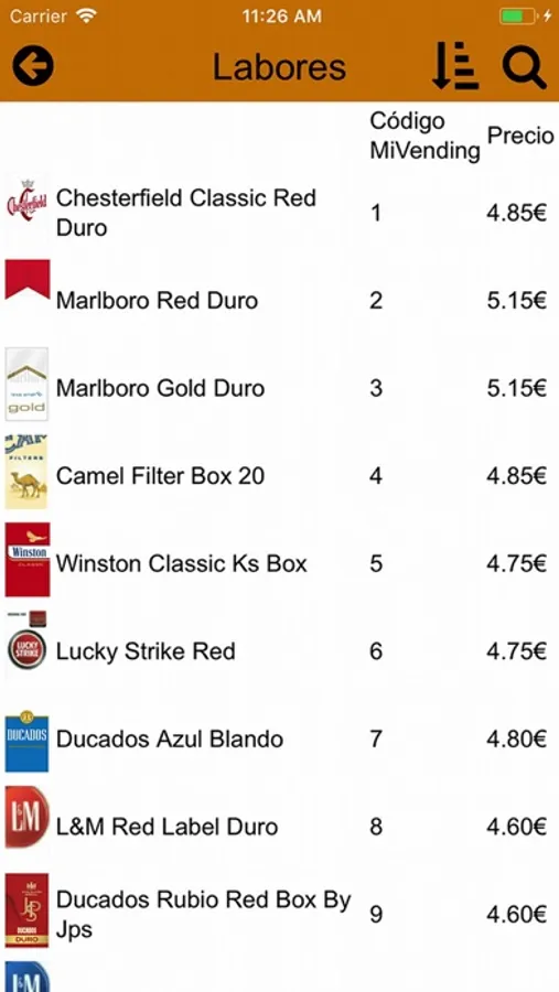 Listado de Código de Labores : En este apartado se detalla un listado de los códigos oficiales que han de utilizarse para el correcto sincronismo entre las máquinas y el sistema de Mivending.